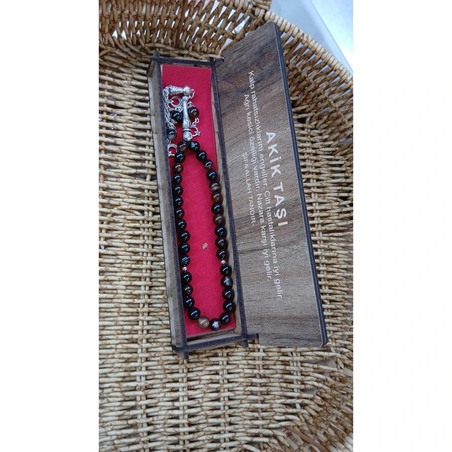 Akik Taşı Tesbih, özel ahşap kutuda sunulan doğal akik taşından yapılmış bir tesbihtir. Manevi değeri ve estetik görünümü ile hediye vermek için uygun.